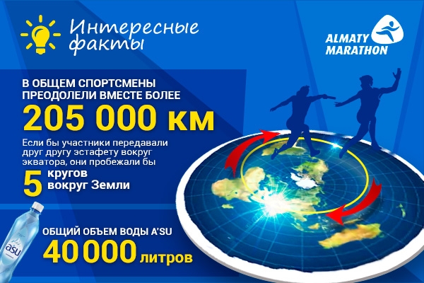 - В общем спортсмены преодолели вместе более 205 000 км. Если бы участники передавали друг другу эстафету вокруг экватора, они пробежали бы пять кругов вокруг Земли.