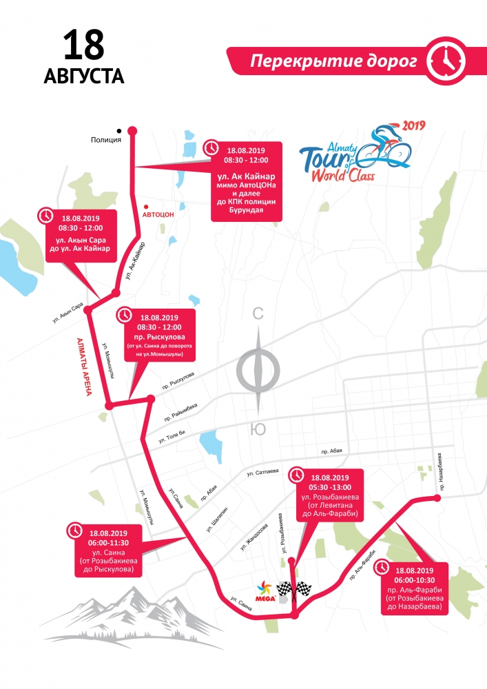 Ежегодная шестая велогонка «Tour of World Class Almaty» 2019 в этом году соберет на старте порядка 850 участников. Соревнование начнется в 8.00 утра со старта детской дистанции в 14 км. Место старта: ТРЦ «Mega Center Alma-Ata» 2.