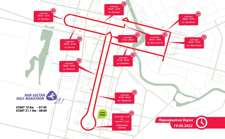 Старт полумарафона в Нур-Султане будет дан на территории МВЦ EXPO. Движение на участке «EXPO» будет перекрыто с 12:00 18 июня до 15:00 часов 19 июня.
