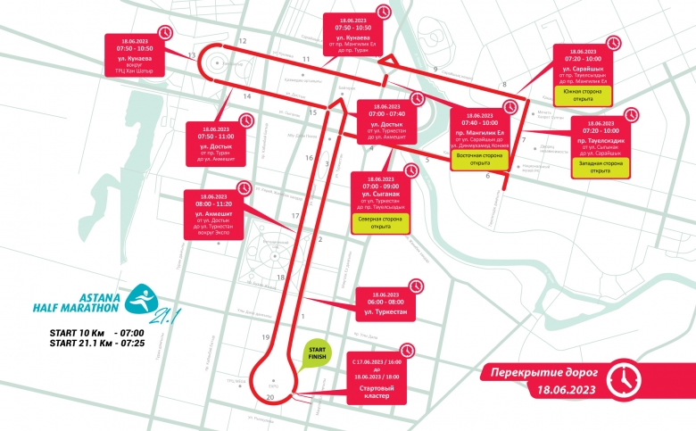 Оргкомитет Astana Half Marathon информирует жителей и гостей столицы о том, что в день полумарафона будет частично перекрыто движение на некоторых участках дорог в местах прохождения дистанции.