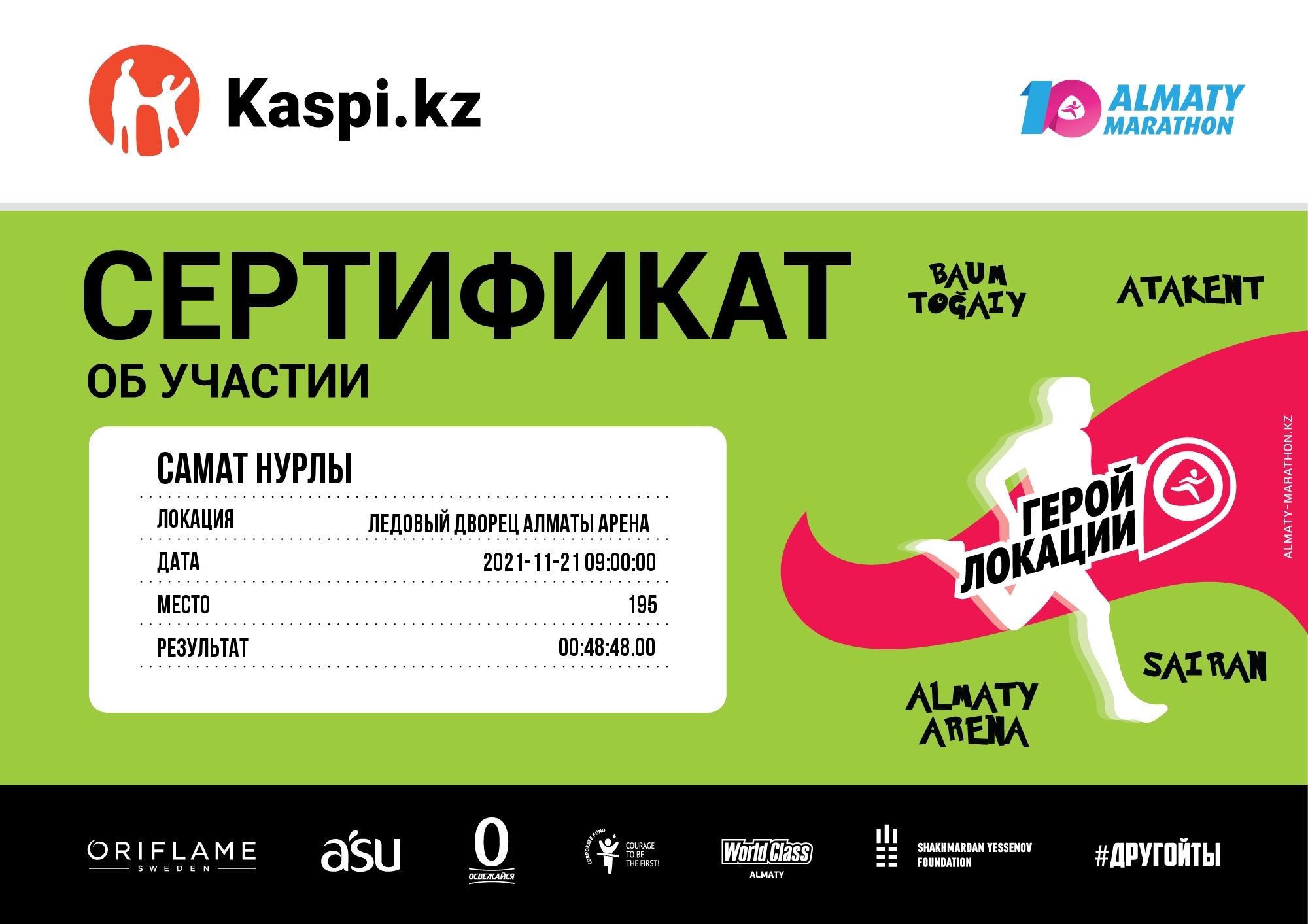 | 183 | Ермек Жақсылық Жақсылық | ![]() | Алматы | 1051 | 00:11:49.00 | 00:37:58.00 | 00:47:48.00 |