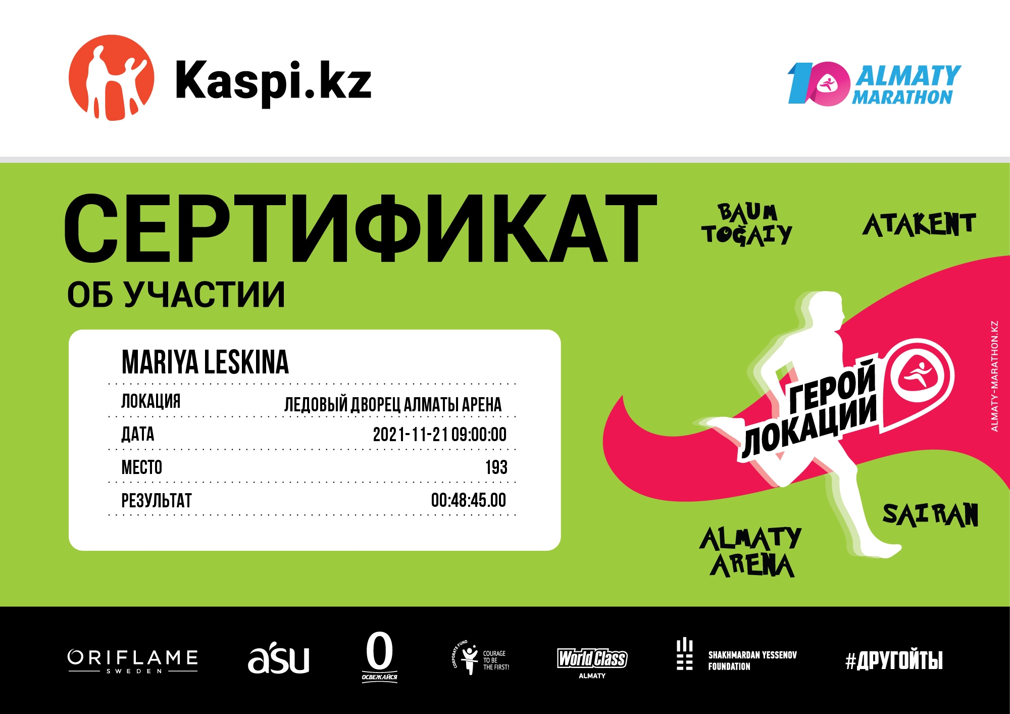 | 202 | Салтанат Умбеткулова | ![]() | Алматы | 1200 | 00:14:02.00 | 00:38:59.00 | 00:49:40.00 |