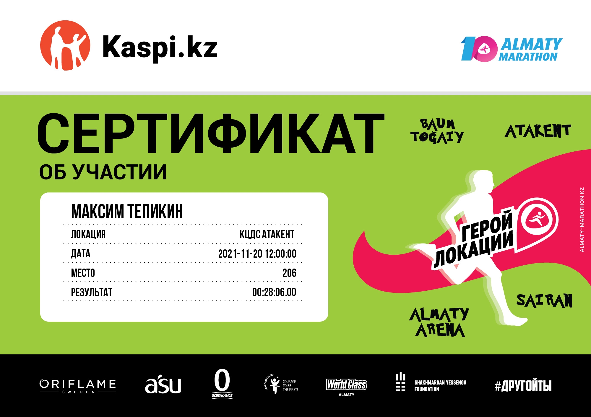| 270 | Аслан Раисов | ![]() | Алматы | 408 | 00:06:18.00 | 00:20:36.00 | 00:32:16.00 |